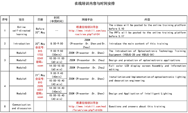 培训内容主要包括五个部分:光电技术实训设备介绍(VGDJS-2D 和 VGDJS-5A)、光电应用终端的设计与制造、全彩LED显示屏组装及信息编辑、光电照明及装饰工程的安装与实施、智能照明控制系统的设计及应用。由深圳信息职业技术学院微电子学院智能光电技术专业沈晓霞和周志文副教授主讲。此外,在此次培训中,世界技能大赛光电技术项目项目经理—马艳红与世界各国专家分享了微电子学院技能型人才培养新模式:产业学院、产教融合互促发展;构建模块课程体系、课程标准对标岗位技能及实施产业承包授课,岗位技能打包负责实现高质量就业。线上培训邀请第一届全国技能大赛光电技术赛项金牌选手的教练团队为大家深度解读光电技术,在收获光电技术重要资讯的同时,开展国际交流,建立国际朋友圈,增进彼此了解。