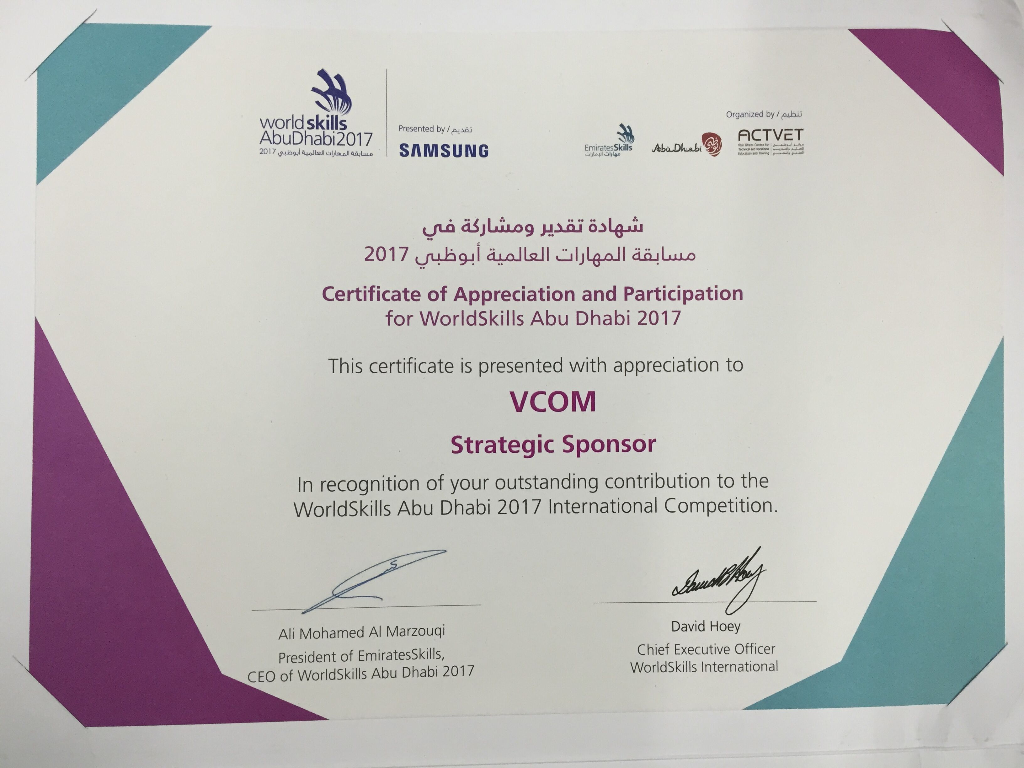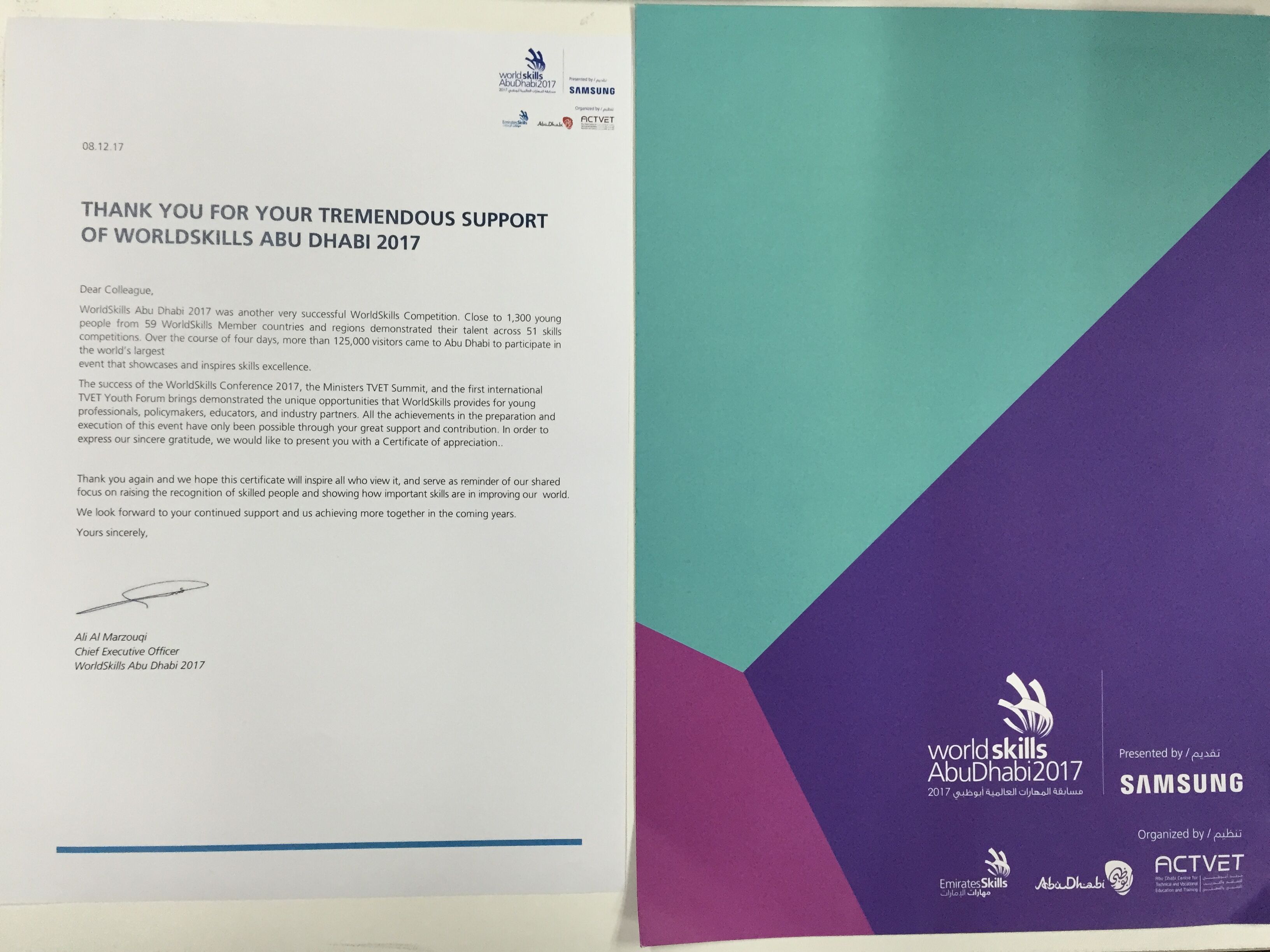 beat365首页教育收到来自第44届世界技能大赛组委会(阿布扎比职业技术教育中心)的一封感谢函和证明文件,内容中表述对我司在第44届世界技能大赛期间,对大赛的大力支持和贡献发挥了重要作用与肯定,同时表示对