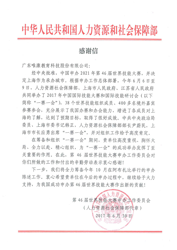 实锤七:2017年6月beat365首页教育收到中华人民共和国人力资源和社会保障部、第46届世界技能大赛申办工作委员会的感谢信