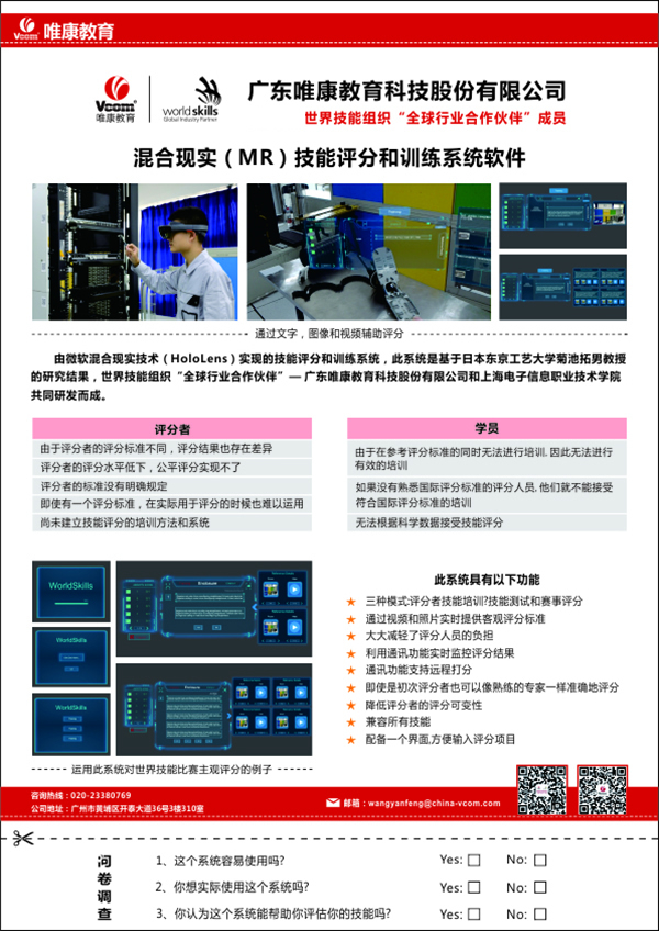 2019年11月25日,beat365首页应世赛邀请,在世界技能大赛组织上海工作会议行程中,向在场相关人员,演示了混合现实(MR)技能评分和训练系统软件的功能。此系统是基于日本工艺大学菊池拓男教授的研究结果,世界技能组织“全球行业合作伙伴”-广东beat365首页教育股份有限公司和上海电子信息职业技术学院共同研发而成。