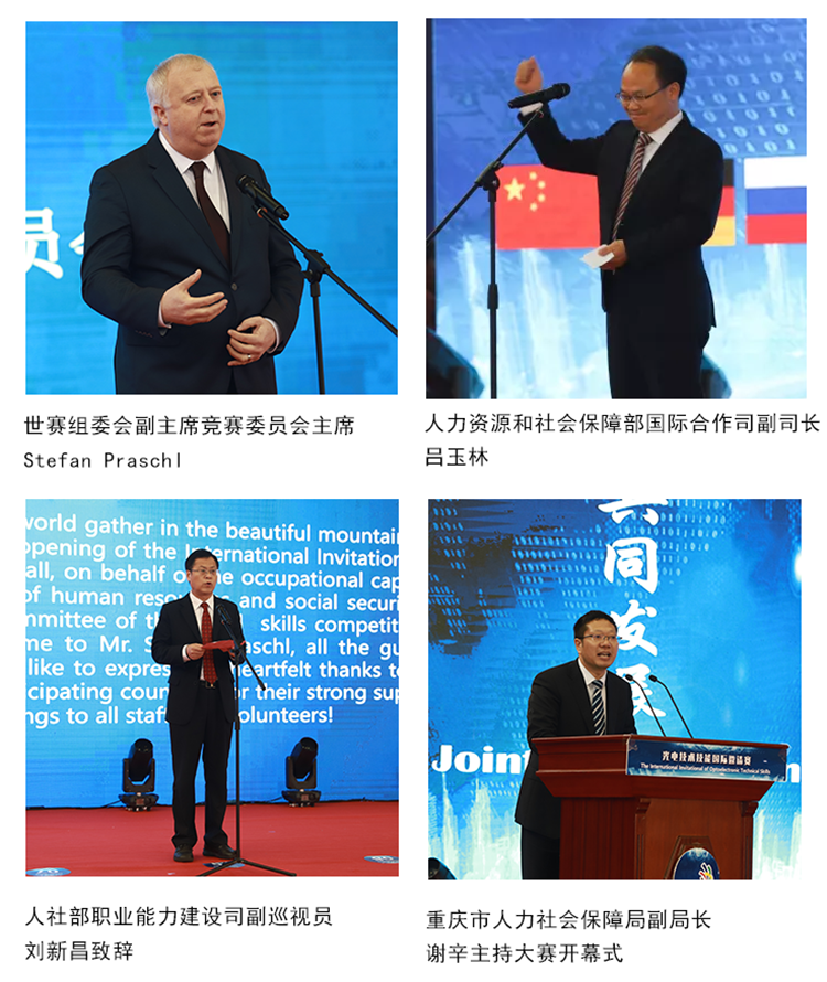 随后,选手代表、裁判代表纷纷上台庄严宣誓,就业指导培训中心副主任袁芳以及重庆市委教育工委委员、市教委副主任邓沁泉为各国参赛队赠送纪念品,人力资源和社会保障部国际合作司副司长吕玉林宣布开赛。