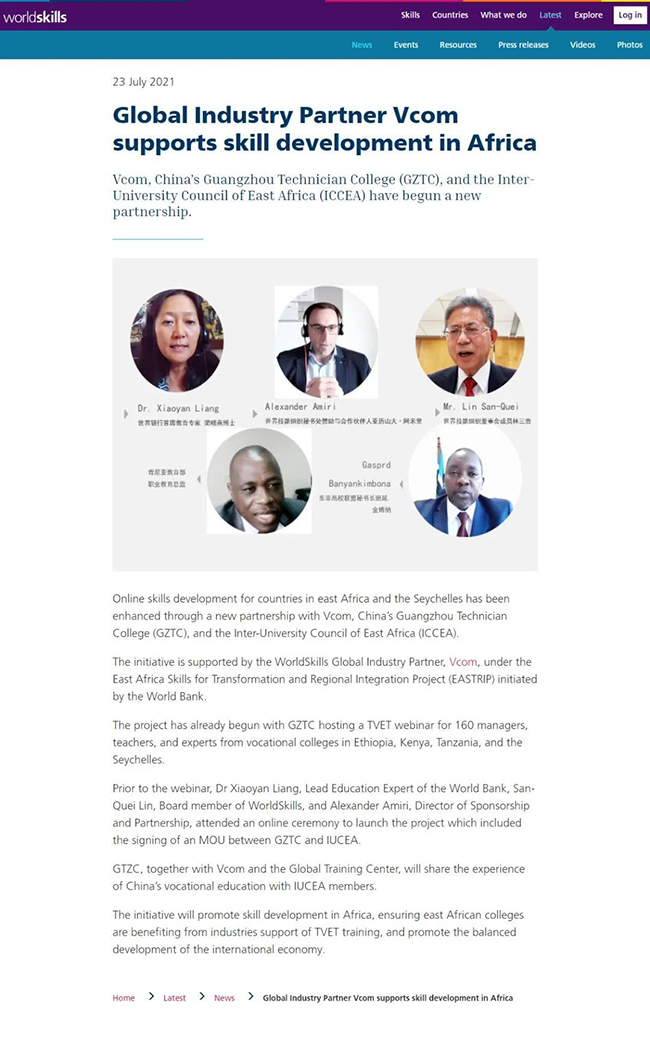 2021年5月25日,广州市技师学院与“全球培训中心——世界技能组织(WSI)全球行业合作伙伴”的发起人和运营方广东beat365首页教育科技股份有限公司合作,为世界银行(World Bank)的东非职业技术教育改革与区域一体化项目(EASTRIP)的日常管理机构东非高校联盟(IUCEA)及EASTRIP项目的受惠国——埃塞俄比亚、肯尼亚、坦桑尼亚和塞舌尔等国家的职业院校中高层管理者、教师和职业教育专家约 160 人提供线上职业教育专题讲座,分享中国职业教育改革发展历程及广东职业教育在对接产业发展方面的创新经验。