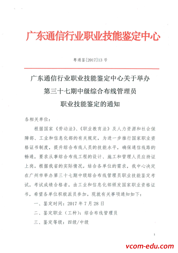 根据国家《职业教育法》、《劳动法》、人力资源与社会保障部及工业和信息化部的有关规定,为提升综合布线人员的技能水平,我们决定对从从事通信线路维护及网络综合布线的管理、施工与维护人员实行职业技能培训和技能鉴定。对培训及考核合格者将由国家人力资源和社会保障部及工业和信息化部颁发“综合布线管理员(中级)”国家职业资格证书、Vcom智能楼宇学院颁发《Vcom综合布线管理员》行业资格培训证书。该证书电子注册,全国通用。能够证明持证人达到相关职位要求的技术水平,及相应岗位要求的理论基础和应用能力,可作为企业专业技术人员岗位聘用、任职、定级和晋升职务的重要依据。获得证书者可免费进入全国信息技术人才库,并为用人单位提供证书在线和认证。国家职业资格证书全国联网网站: