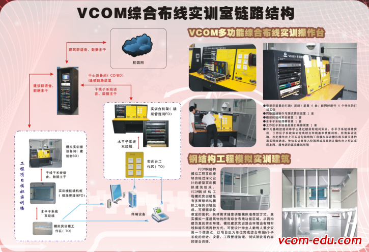 Vcom是国内专业从事智能楼宇综合布线系统产品生产厂商,强大的研发团队和生产技术,开发了职业教育网络专业所需的综合布线实训室解决方案以及性能优越的超五类非屏蔽、超五类屏蔽、六类综合布线系统、七类综合布线系统与智能楼宇弱电电缆系列产品。依托公司在行业的品牌度,智能楼宇学院对智能楼宇行业的发展历史、现状和未来有相当深度的掌握,能够更加准确地按照市场需求对专业人才进行技能培训。
