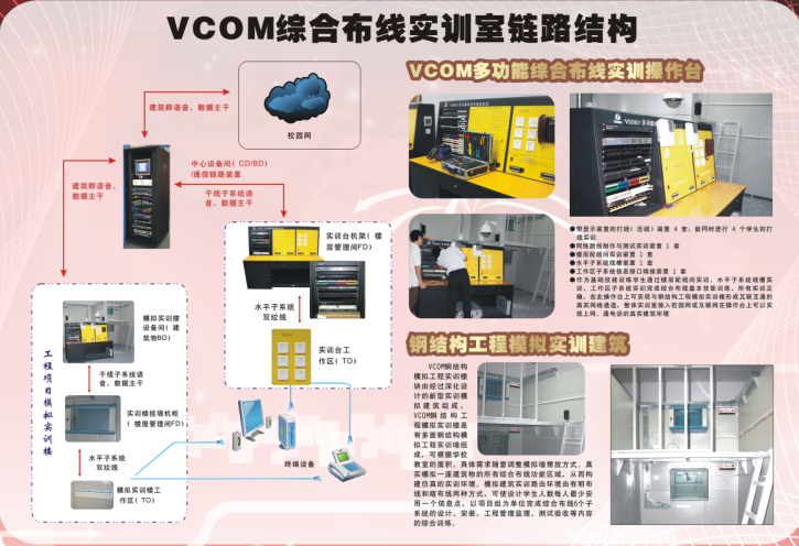 Vcom是国内专业从事智能楼宇综合布线系统产品生产厂商,强大的研发团队和生产技术,开发了职业教育网络专业所需的综合布线实训室解决方案以及性能优越的超五类非屏蔽、超五类屏蔽、六类综合布线系统、七类综合布线系统与智能楼宇弱电电缆系列产品。依托公司在行业的品牌度,智能楼宇学院对智能楼宇行业的发展历史、现状和未来有相当深度的掌握,能够更加准确地按照市场需求对专业人才进行技能培训。