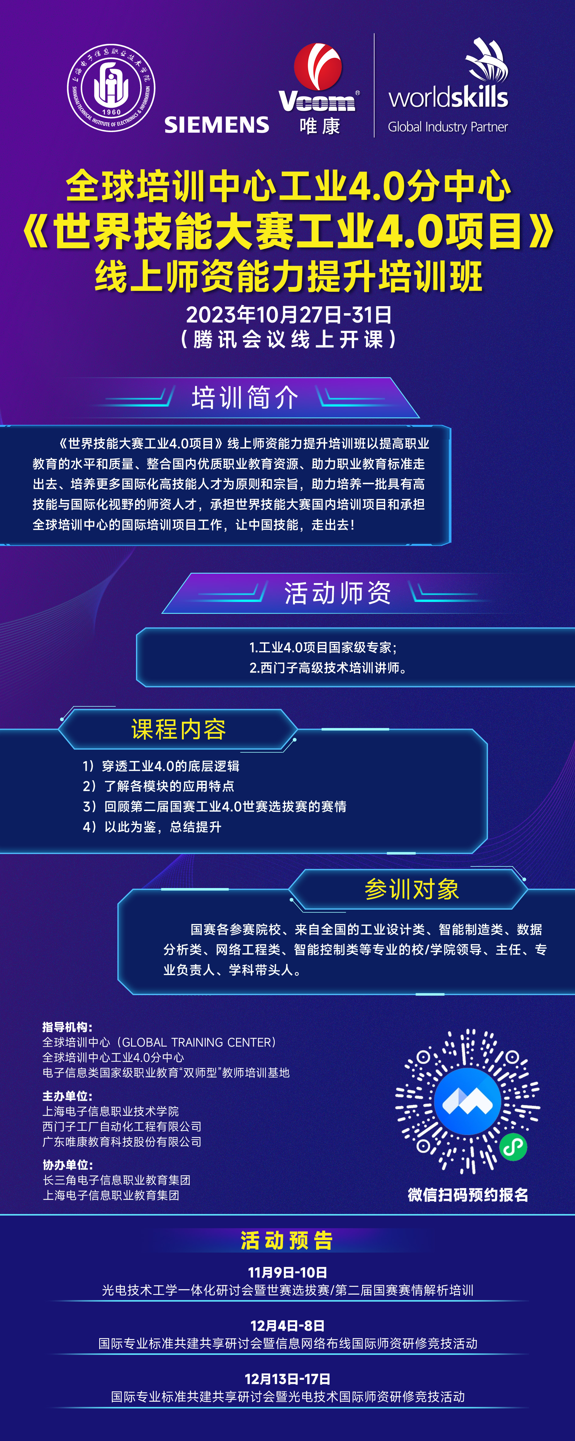 《世界技能大赛工业4.0项目》线上师资能力提升培训班,由全球培训中心(Global Training Center)、全球培训中心工业4.0分中心、电子信息类国家级职业教育“双师型”教师培训基地指导,上海电子信息职业技术学院、西门子工厂自动化工程有限公司与广东beat365首页教育科技股份有限公司联合主办,长三角电子信息职业教育集团、上海电子信息职业教育集团协办,为期5天,诚挚邀请您拔冗参与。